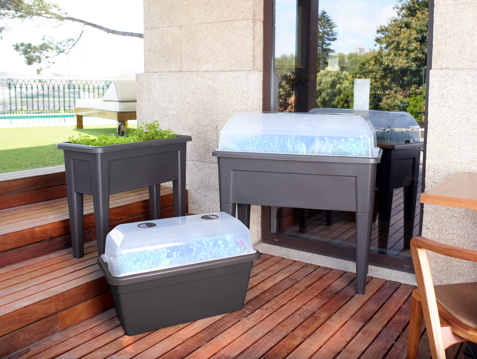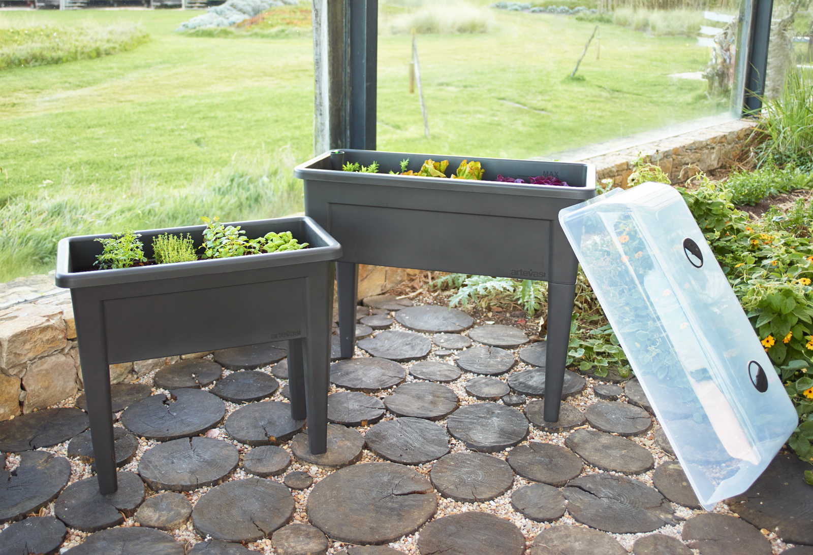 Tampo transparente de horta urbana, com acabamento translúcido, indicada para uso exterior e interior. Inclui dois respiros para circulação de ar. Proteção UV no pigmento. Complementável com horta urbana ou floreira XL. Produzido em Portugal.